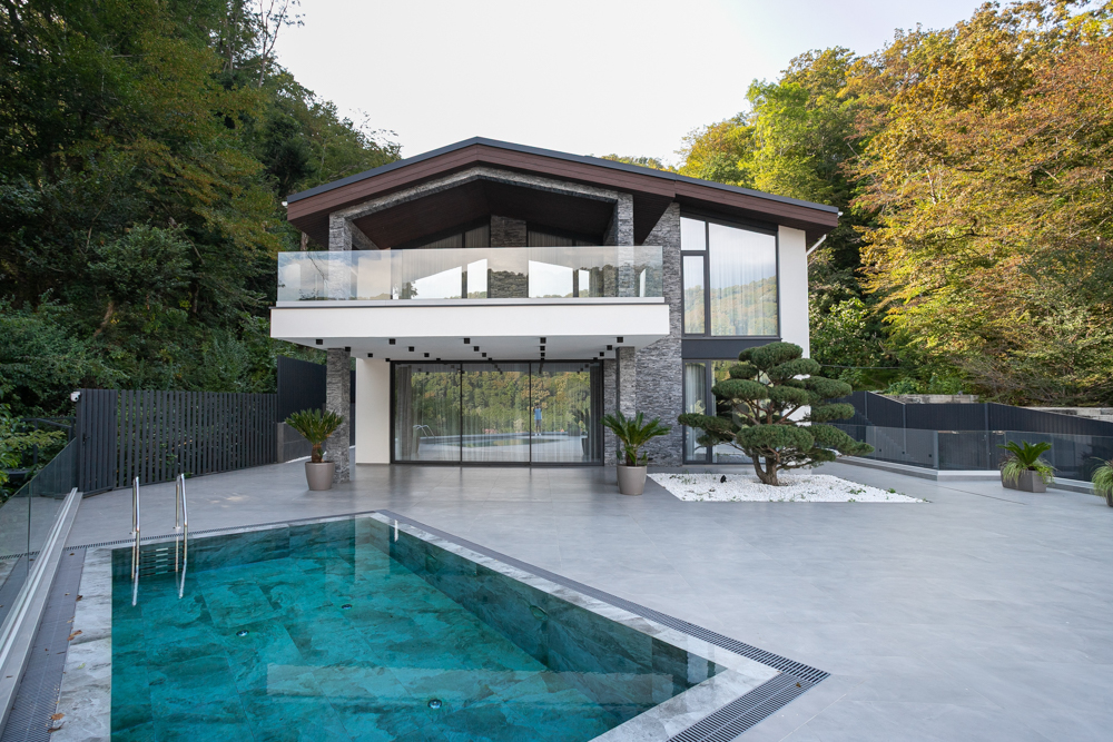 Участок с ландшафтным озеленением, выполнен в нескольких уровнях. На самом первом уровне размещается заезд в гараж, в котором оборудована винная комната и комната для хранения зимнего оборудования. На втором уровне располагается прекраснейшая зона отдыха у бассейна с панорамой на горы, а также есть выход в лесопарковую зону, где можно прогуливаться и наслаждаться природой.